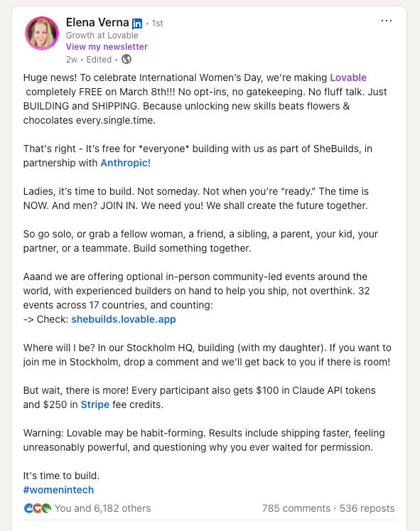 Just look at the partnership between Elena Verna and Lovable. Elena has the deep trust of the growth community (the Signal). Lovable provides the builder to turn her growth expertise into a functional tool (the Engine).